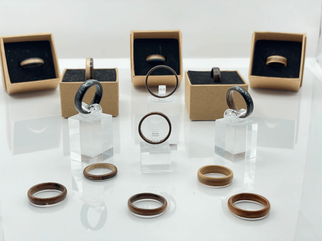 Authentiek handwerk in houten sieraden en accessoires. Wij maken houten luxe-, Verlovings- en trouwringen.